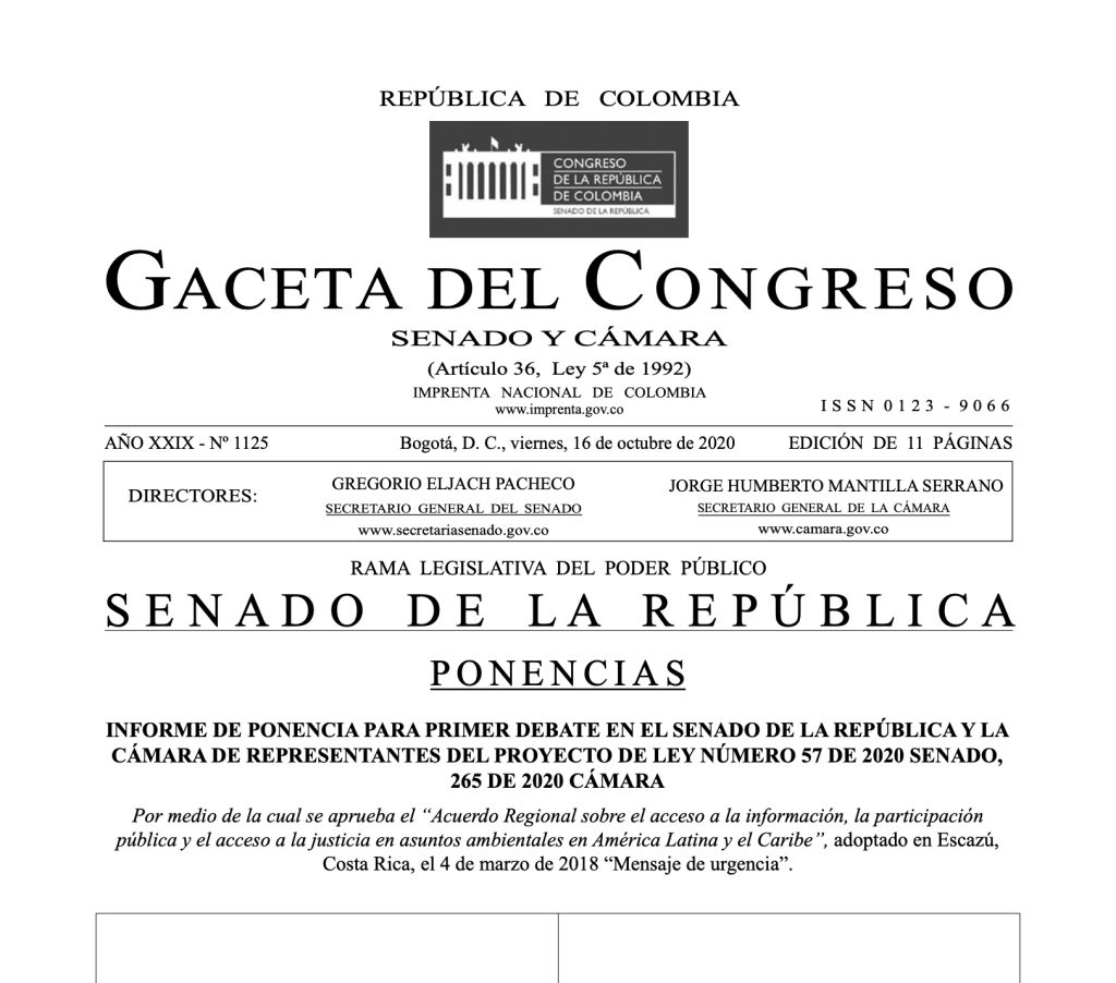 En 2020, el Gobierno Nacional radicó el proyecto de ley de ratificación del Acuerdo de Escazú (PL 057 en Senado y PL 265 en Cámara), formalizando su trámite legislativo y el compromiso de Colombia con los derechos de acceso ambiental y la democracia participativa. El 31 de julio, la Gaceta del Congreso No. 587 publicó los proyectos de ley.